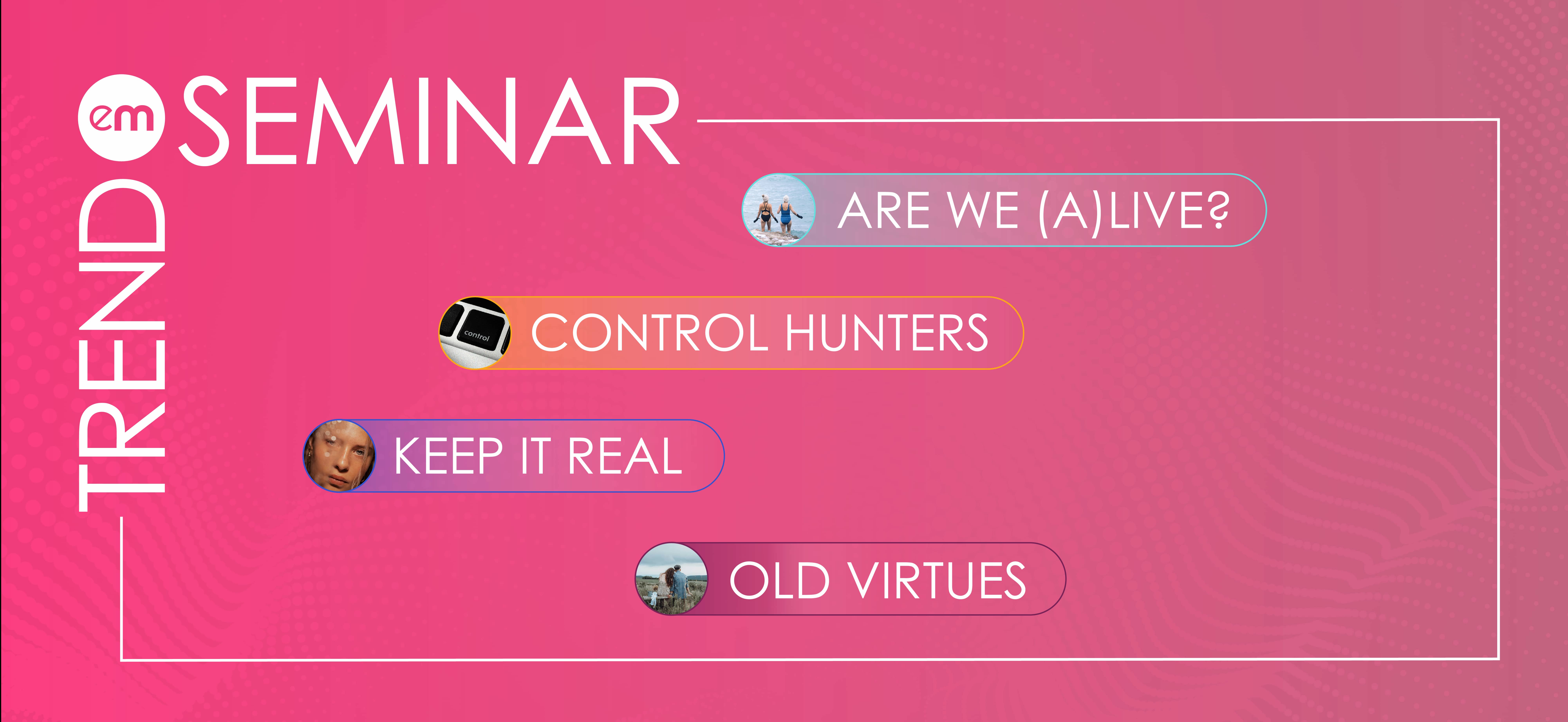 The Trend Seminar 2025 will enlighten you on how consumers perceive themselves and the world. Join us in Aarhus or Copenhagen to learn more about the four trends: Are We Alive?, The Control Hunters, Keep It Real, and Old Habits.